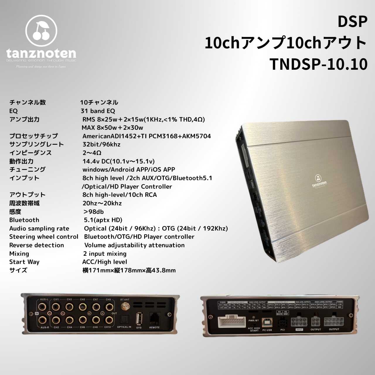 - DSP10chアンプ10chアウト TNDSP-10.10は、革新的なカーオーディオ体験を提供するために設計された、最先端のデジタルシグナルプロセッサーです。10chのチャンネルを持ち、パワフルな出力と洗練された音質調整を兼ね備えており、音楽の表現力を大幅に向上させます。あらゆる音楽ジャンルを美しく再現し、あなたのドライブをより豊かに彩ることができます。